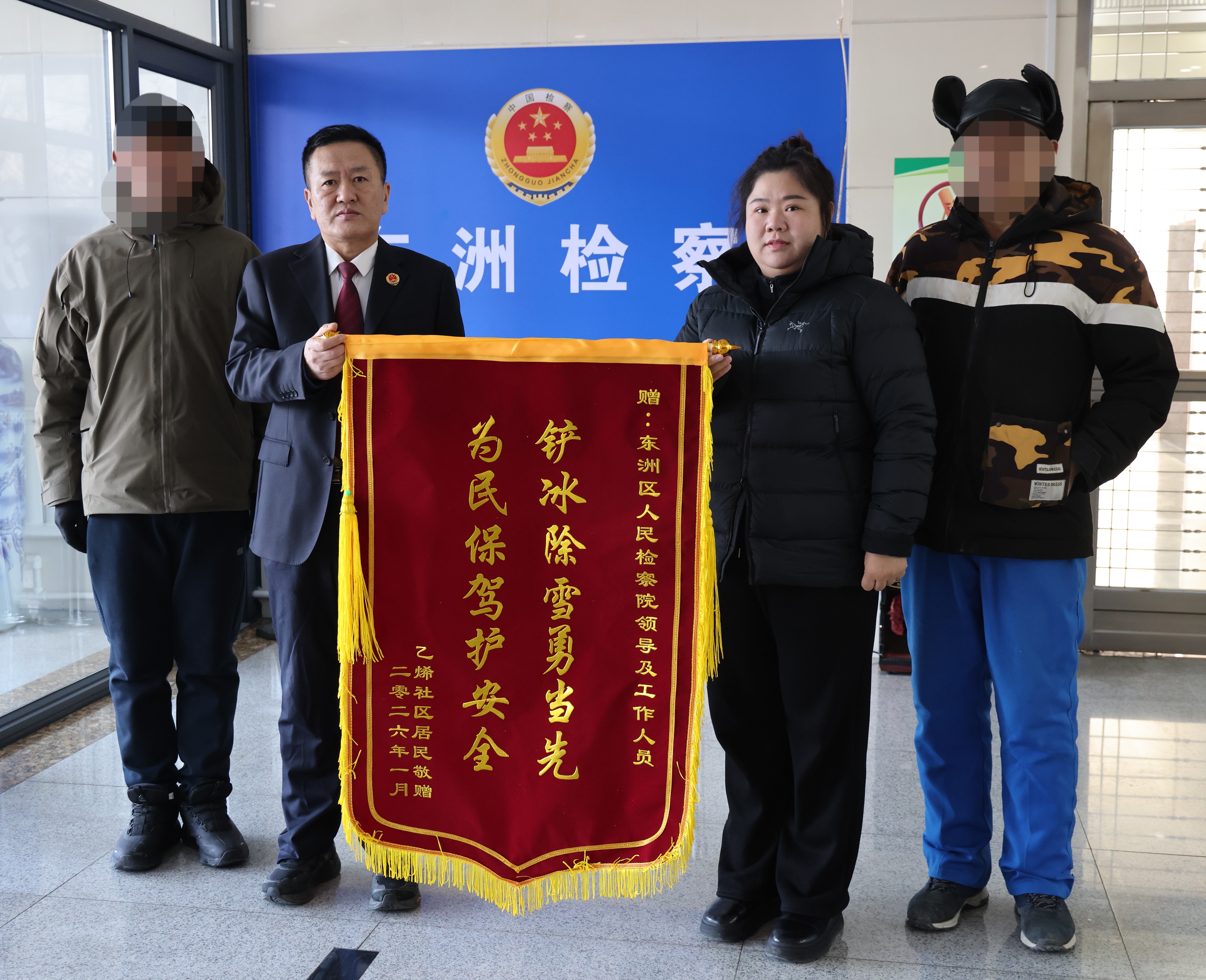 2026年1月21日,东洲区东洲街道乙烯社区党委书记、居委会主任紧紧握住东洲区人民检察院政治部主任的手,对检察院在包保辖区志愿服务工作中的倾力付出表达诚挚谢意。
